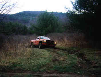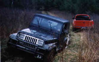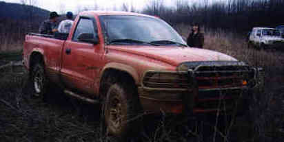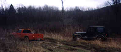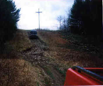 So I go back down through the woods to get behind him and give him a yank out...that's me in the red again...with the mighty V8 and new mud tires