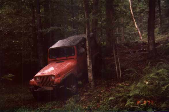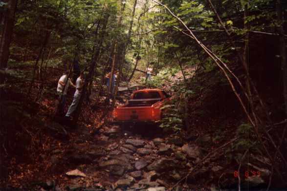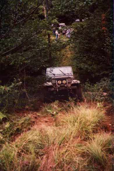 Here I am with my left front tire over "the rock" but the rear just will not bounce over it...as you can see by the tire smoke I did not give up easily ( or cheaply )...this is as far as I got all 6 times I tried to go up this hill...finally I just went as far as I could and got a tug from one of the Jeeps. |
